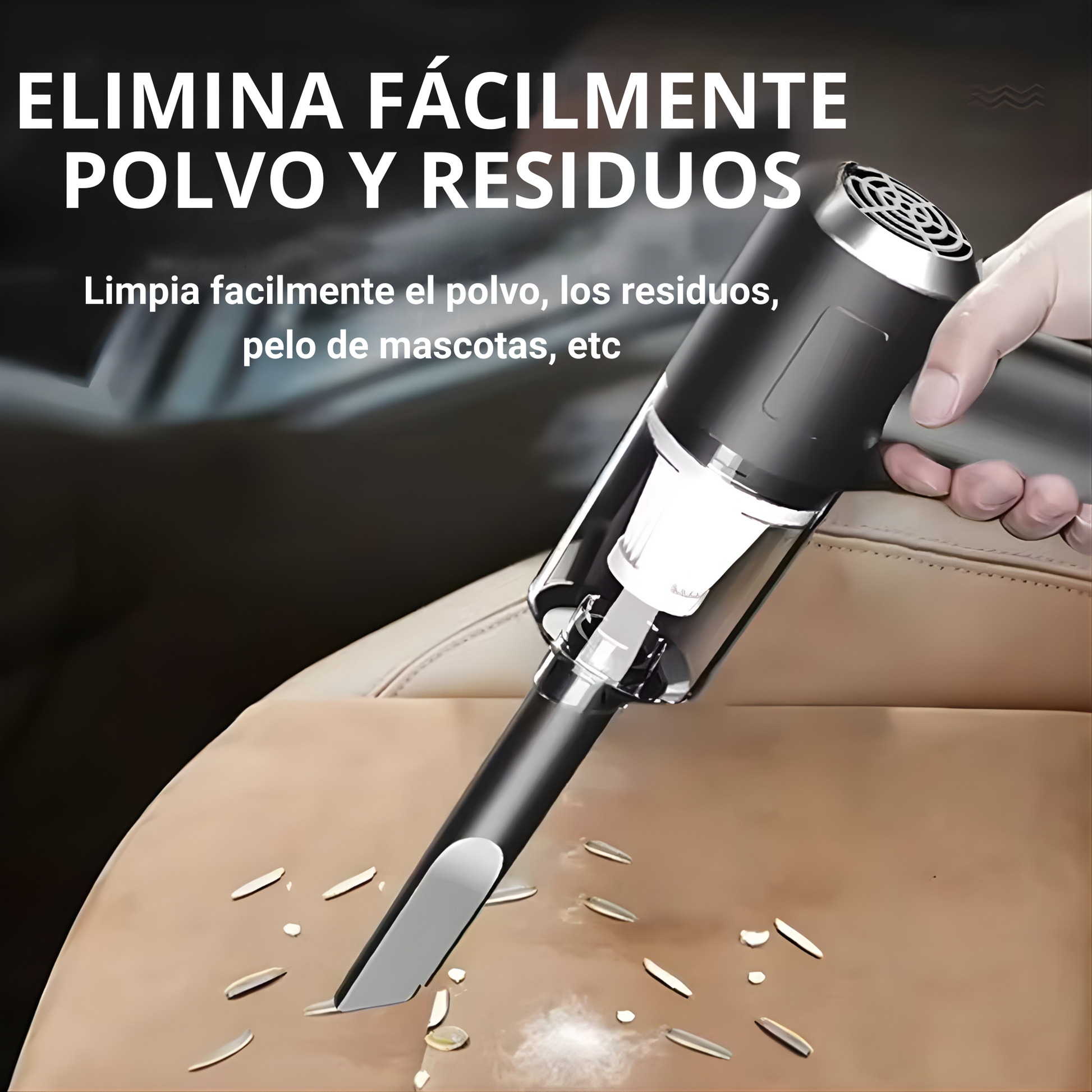 Sí. Su motor de alta potencia está diseñado para eliminar polvo, migas, pelos y residuos adheridos en diferentes superficies, incluyendo tapicería y asientos de automóvil.